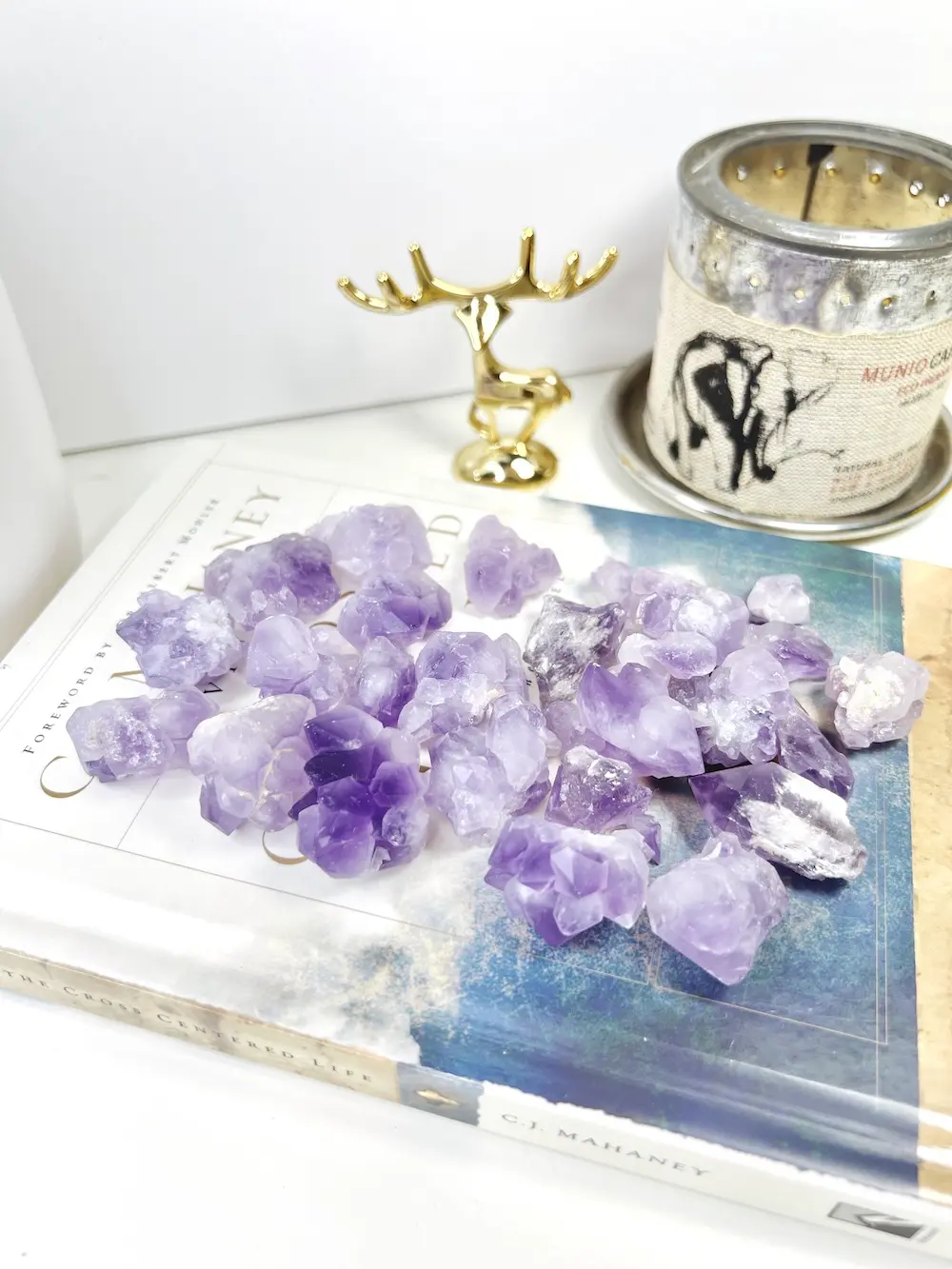 照片上所有的碎水晶紫水晶是一種能平衡身心靈的寶石,能幫助釋放壓力和疲勞,提升專注力,不讓外界干擾,適合放在工作室或辦公室。同時,紫水晶也被認為能增進家庭和諧,促進家人之間的情感交流,使家庭更加和睦。它的能量有助於提升人的直覺和洞察力,是靈性修行的良伴,據說放在枕頭下入睡,可引發預知夢,深受追求心靈平靜者的喜愛。